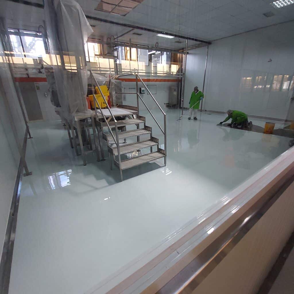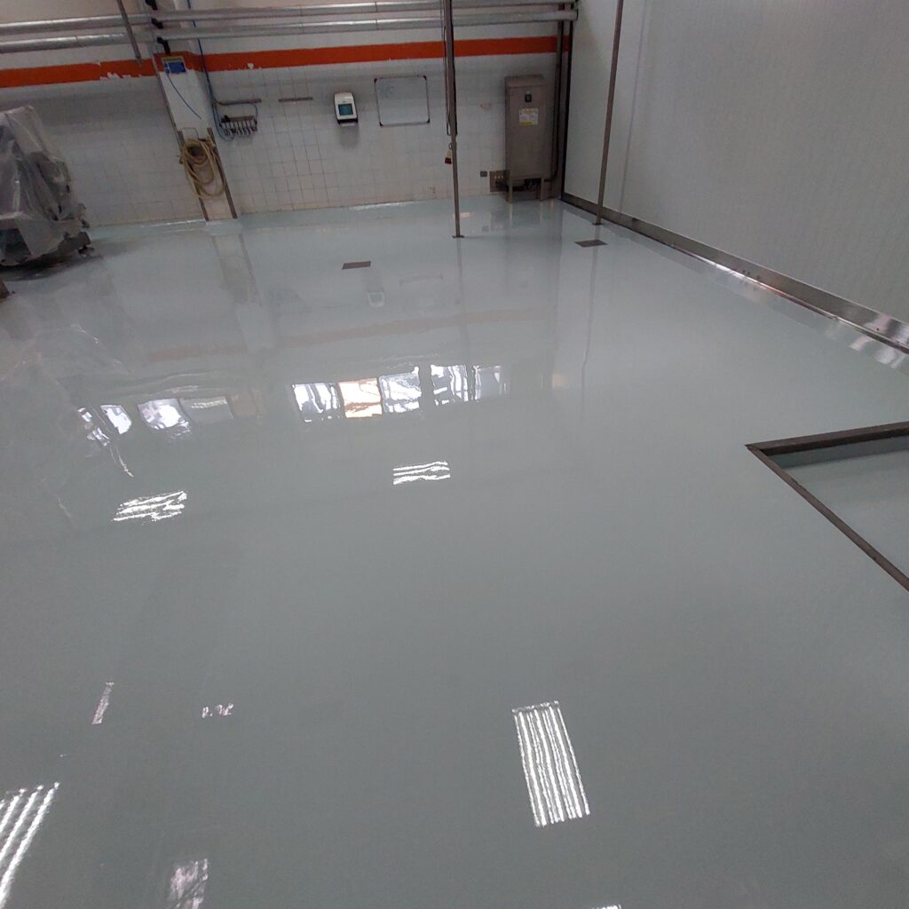 • Retiro de vinyl, pulido de placa, sello de juntas con micromortero epóxico, imprimación 60% sólidos, sello final con epóxico autonivelante, color: gris.