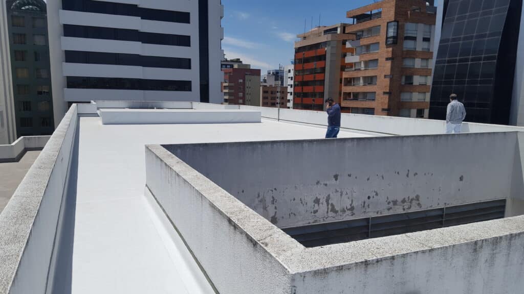 Detalles: Terraza central de institución financiera privada, presenta impermeabilización sobre tejuelo -tipo pintura -deteriorada y filtraciones por juntas.